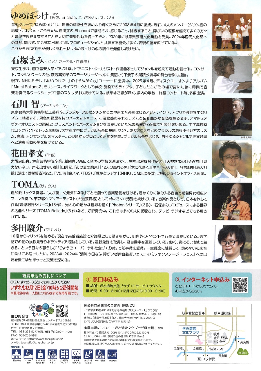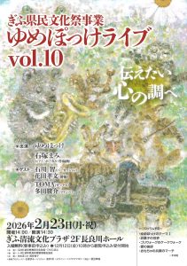 2025年12月10日 カテゴリー:他団体等のイベント 「ぎふ県民文化祭事業 ゆめぽっけライブvol.10」開催のお知らせ TASCぎふ(岐阜県障がい者芸術文化支援センター)様 からお知らせが届きました。 ぎふ県民文化祭事業 ゆめぽっけライブvol.10 開催日時 2026年2月23日(月・祝) 開場14:00/開演14:30 会 場 ぎふ清流プラザ2F 長良川ホール(岐阜市学園町3-42) 入場料 無料(要事前申込)※12月12日(金)10時から観覧申込受付開始 詳しくは、主催者のホームページをご覧ください。 ホームページはこちら チラシのダウンロードはこちら FacebooktwitterHatenaPocketCopy