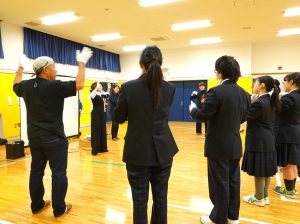 ドイツ語の歌詞と意味について説明を聞き、歌詞に合わせた手の動きをまねて「手歌」を体験しました。