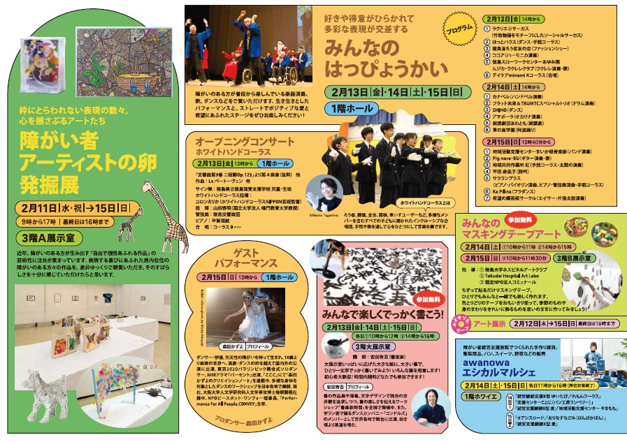 期間中は、あわぎんホールを会場に美術・舞台芸術・ワークショップなどを開催し、年齢・性別・国籍・障がいの有無に関わらず「みんな」で楽しめるイベントとなっております。